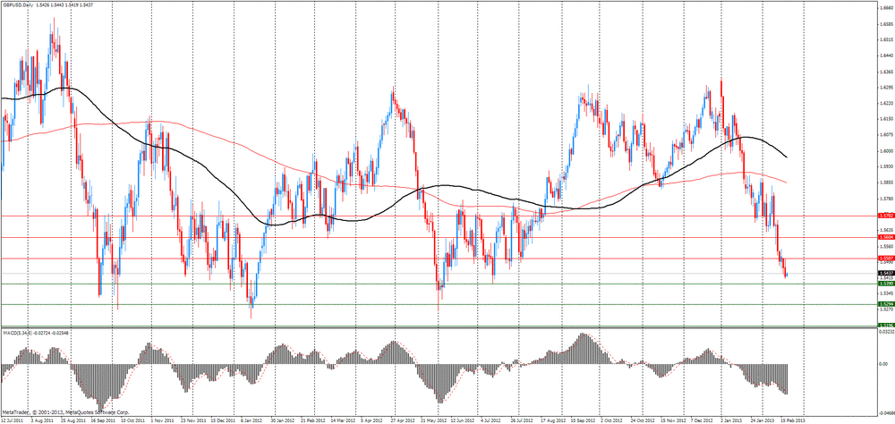 Фунт упал до 15-месячного минимума против евро после того, как протоколы Банка Англии показали, что часть чиновников проголосовали за расширение программы по покупке активов на заседании в этом месяце. Стерлинг упал до самого низкого уровня с июня по отношению к доллару после того, протоколы показали, что политики также рассматривали сокращение процентных ставок. Отметим, что Мервин Кинг, Пол Фишер и Дэвид Майлз в ходе голосования выступили за увеличение программы по покупке облигаций на 25 млрд фунтов стерлингов ($ 38,3 млрд) до 400 млрд фунтов, в то время как оставшиеся шесть членов Комитета по монетарной политике выступили против данного увеличения. Также давление на валюту оказывали представленные данные, которые показали, что согласно расчетам Международной организации труда, число безработных в течение трех месяцев (по декабрь) выросло на 10 000, составив при этом 2,5 млн. человек, на фоне чего уровень безработицы поднялся до отметки 7,8%, по сравнению с 7,7% тремя месяцами ранее (до ноября). В то же время Управление национальной статистики сообщило, что численность безработных за этот же период уменьшилась на 14 тысяч. Также УНС заявило, что число занятых людей увеличилось на 154000 (в течение трех месяцев по декабрь), достигнув при этом уровня 29,730 млн., что является самым высоким показателем с начала введения регистрации в 1971 году. Кроме того, Управление национальной статистики сказало, что количество заявлений на получение пособий по безработице упало по итогам января на 12 500 до 1,54 миллиона.