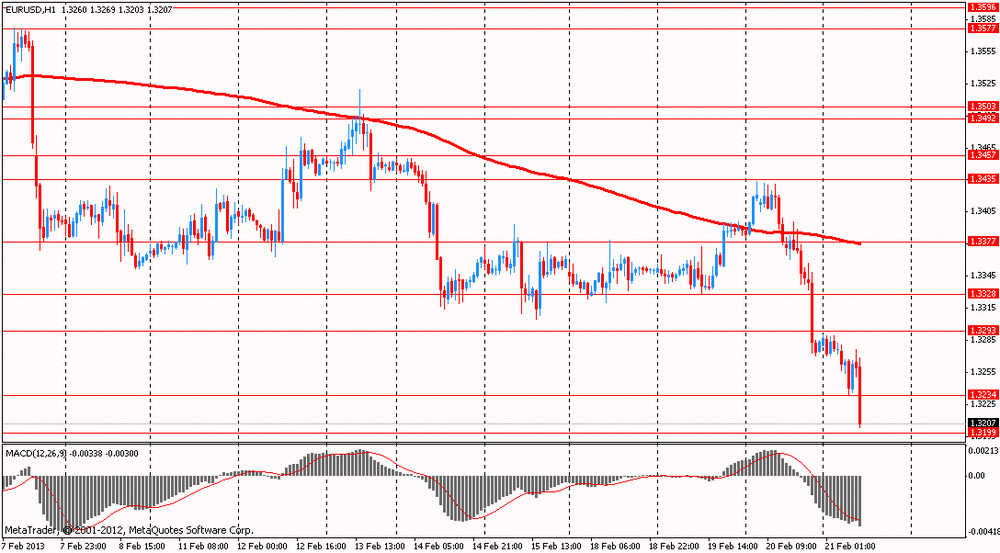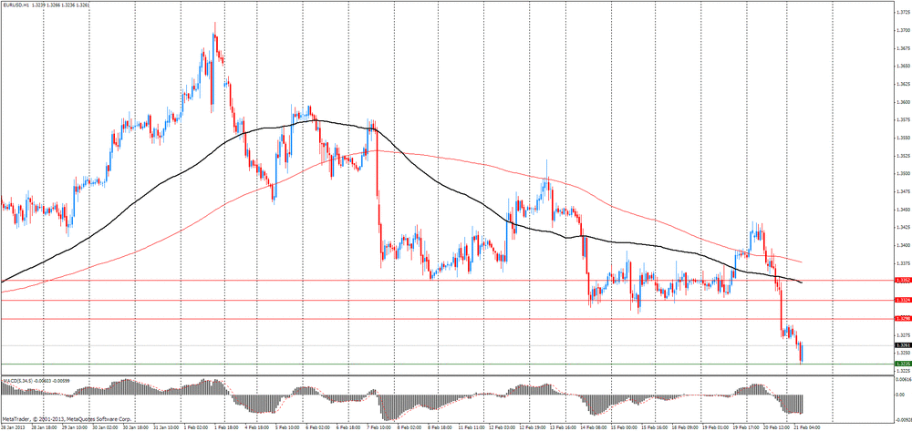 Курс евро снизился ниже $1,32 впервые за шесть недель после того, как отчет показал, что деловая активность в сфере услуг и производства в регионе сократилась в феврале более быстрыми темпами, чем прогнозировали экономисты. Согласно отчету, сводный индекс, которые оценивает активность в секторе производства и в сфере услуг упал в феврале до уровня 47,3, по сравнению с 48,6 в январе. Заметим, что согласно средним прогнозам значение данного показателя должно было увеличиться до отметки 49. В то же время данные показали, что индекс деловой активности в секторе услуг опустился до уровня 47.3, по сравнению с 48.6 в январе, а также средними оценками экспертов на отметке 49,2. Между тем, индекс деловой активности в производственном секторе снизился до уровня 47,8 с 47,9 в январе.