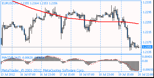 Поддержку курсу евро в понедельник оказала статистика из еврозоны по профициту внешнеторгового баланса, который вырос в мае до 6,9 миллиарда евро с пересмотренного показателя апреля в 3,7 миллиарда евро. Аналитики полагали, что профицит в мае составит четыре миллиарда евро. Евро достиг шестинедельного минимума против иены после того, как уровень инфляции в еврозоне в прошлом месяце достиг самого низкого значения с февраля 2011 года. Доллар упал против иены и стер прибыли по отношению к евро после того, как розничные продажи в США неожиданно упали, усилив предположения, что ФРС будет предпринимать дальнейшие шаги по укреплению экономики. Объем розничных продаж в США в июне 2012 года снизился на 0,5% по сравнению с маем и составил в денежном выражении 401,5 миллиарда долларов. Аналитики при этом ожидали роста продаж на 0,2%. Уменьшение продаж происходит в стране третий месяц подряд. Во вторник основные валютные пары проявили высокую волатильность на фоне выступления председателя ФРС Бена Бернанке в Конгрессе. Доллар вырос в начале выступления, так как первая реакция участников рынка была негативной, поскольку каких-либо конкретных сигналов относительно новых мер стимулирования американской экономики озвучено не было. Однако позже слова Бернанке о том, что понижательные риски усилились, были восприняты как один из таких сигналов. Бернанке снова повторил, что “федрезерв готов принять меры в случае необходимости”, и что “восстановление рынка труда проходит крайне медленно”. Давление на евро также оказали слабые данные по Индексу настроений в деловой среде от института ZEW, который упал до -19,6 в июле с -16,9 в июне. В среду в течение американской сессии доллар ослабил свои позиции против высокодоходных валют на фоне второй части выступления председателя ФРС Бена Бернанке в Конгрессе. Текст выступления Бернанке повторил речь, произнесенную им накануне. Хотя Бернанке подчеркнул готовность ЦБ к действиям, он воздержался от предоставления каких-либо деталей и не сообщил, будет ли это количественное смягчение и когда именно такие меры могут быть приняты. Ранее евро снизился после того, как канцлер Германии Ангела Меркель заявила, что «европейский проект» находится под угрозой, и если политики будут больше работать, подогревая интерес к решению долгового кризиса в регионе, он останется невыполнимым. Евро в четверг упал по отношению к доллару после того, как министр финансов Германии Вольфганг Шойбле заявил, что власти Испании должны взять на себя гарантии по финансированию фонда спасения, усилив опасения по поводу усиления суверенного долгового кризиса. Евро упал против иены, что было вызвано увеличением доходности облигаций Испании. Испания в четверг продала гособлигации со сроками обращения 2, 5 и 7 лет на общую сумму 2,98 млрд евро, что чуть ниже верхней границы целевого диапазона, находившейся на уровне 3 млрд евро.Спрос на бумаги снизился, что привело к резкому повышению стоимости заимствования для Мадрида. Между тем Франция 19 июля успешно разместила три транша векселей на 8,96 млрд евро. Средневзвешенная доходность при размещении 5-летних бумаг упала до рекордного минимума в 0,86% годовых против 1,43% в июне. Доходность 4-летних векселей снизилась с 1,05% до 0,53%. Поддержку единой валюте оказала новость о том, что агентство Fitch подтвердило рейти