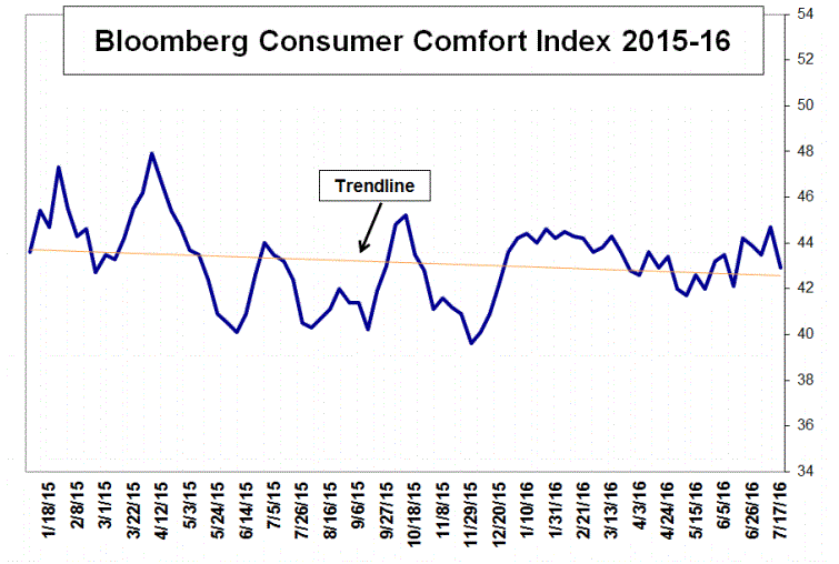 Согласно данным, за неделю, завершившуюся 17 июля, индекс потребительского комфорта опустился до 42,9 пункта против 44,7 пункта неделей ранее (девятимесячный максимум).