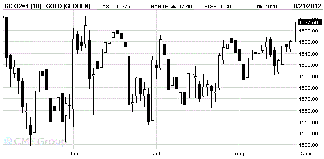 Стоимость августовского фьючерса на золото на COMEX сейчас составляет 1637.5 доллара за унцию.