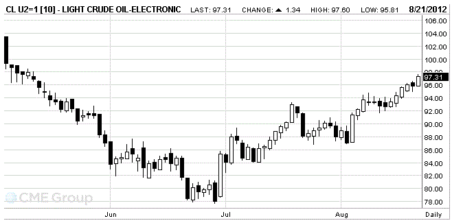 Стоимость сентябрьских фьючерсов на американскую легкую нефть марки WTI (Light Sweet Crude Oil) на NYMEX сейчас составляет $97,31 за баррель.