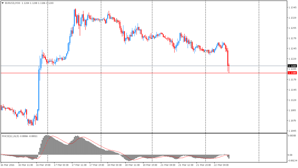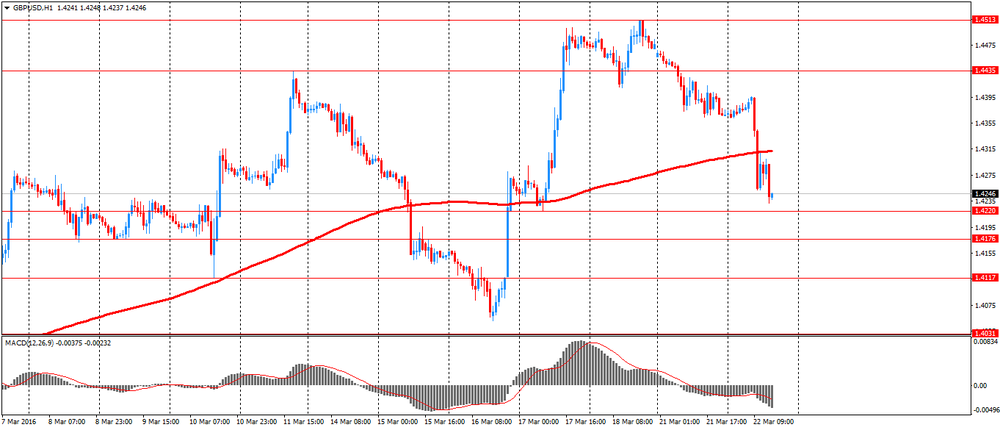 Фунт подешевел почти на 200 пунктов против доллара, обновив минимум 17 марта, что было связано с атаками террористов в Брюсселе. По мнению экспертов, после сегодняшних событий Британии может начать стремиться к большей изолированности от других стран ЕС, а британцы будут больше склоняться к голосованию за выход страны из блока в ходе референдума 23 июня. Еще одним фактором снижения фунта были инфляционные данные. Управление национальной статистики сообщило, что потребительские цены выросли на 0,3 процента в феврале по сравнению с годом ранее, как и в январе. Ожидалось, что цены увеличатся на 0,4 процента. В месячном измерении потребительские цены выросли на 0,2 процента, компенсировав 0,8 процента падения в январе. Экономисты прогнозировали рост на 0,4 процента. Базовая инфляция без учета энергии, продуктов питания, алкогольных напитков и табачных изделий осталась стабильной на уровне 1,2 процента. В другом докладе ONS показано, что отпускные цены упали на 1,1 процента после ослабления на 1 процент в январе. Снижение было меньше ожидаемого падения на 1,2 процента. В то же время, за месяц отпускные цены выросли на 0,1 процента, компенсировав январское падение на 0,1 процента. Закупочные цены продолжили тенденцию к снижению в феврале. Закупочные цены упали на 8,1 процента после уменьшения на 8 процентов в январе. Цены, как ожидалось, сократятся на 7,4 процента. В месячном исчислении, закупочные цены повысились на 0,1 процента по сравнению с 1,1 процента снижения в январе.