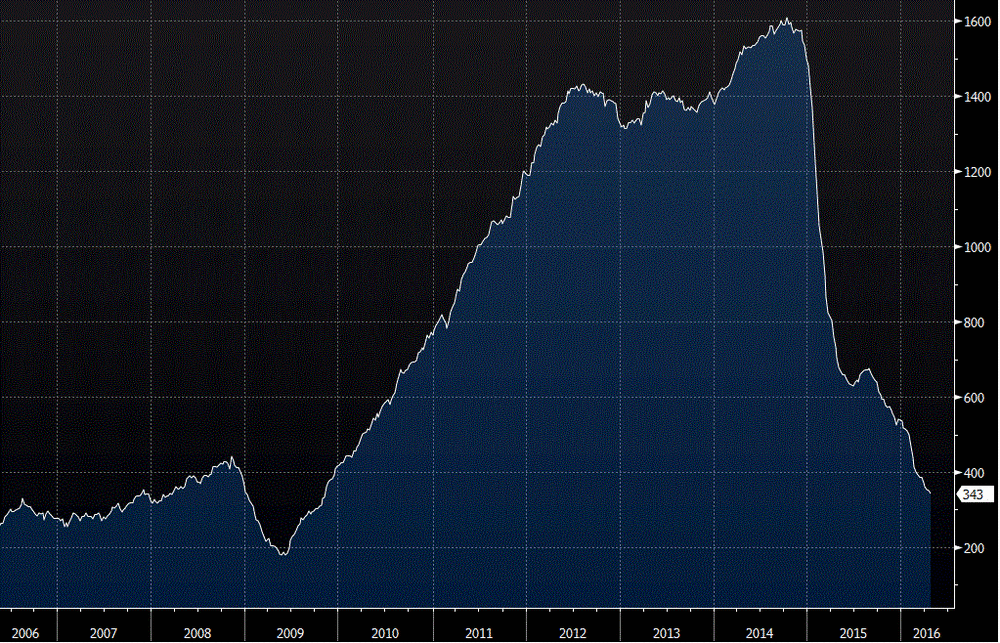 Отчет нефтесервисной компании Baker Hughes показал: с 16 апреля по 22 апреля количество активных буровых установок по добыче нефти в США снизилось на 8 единиц - до 343 единиц, что на 79% меньше рекордного значения, зафиксированного в октябре 2014 года (1609 единиц). Последнее чтение также было самым низким с ноября 2009 года. Число установок по добыче газа уменьшилось до 88 единиц с 89 единиц. Тем временем, общее число буровых установок (газовых и нефтяных) сократилось на 9 единиц, до 431 единиц, записав при этом 17-е недельное снижение подряд и достигнув 41-летнего минимума.