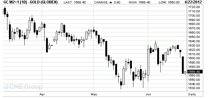 Июньский фьючерс на золото на COMEX сегодня подешевел до 1562.8 доллара за унцию.