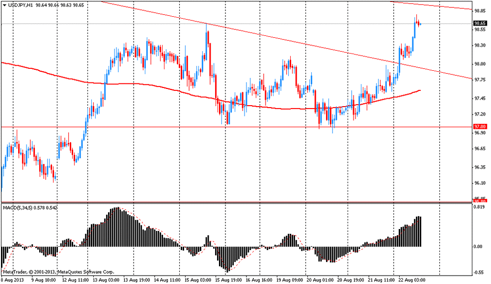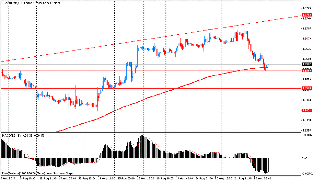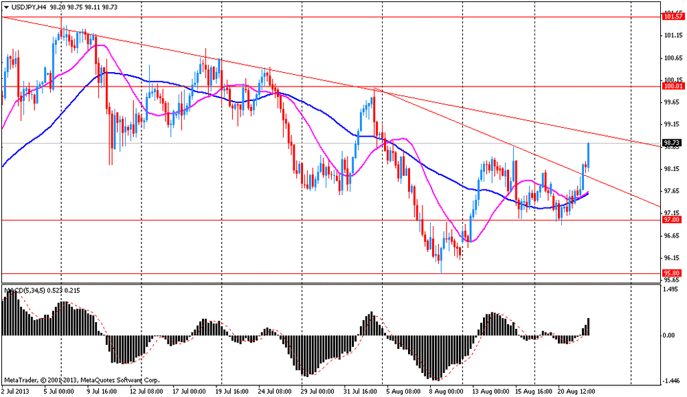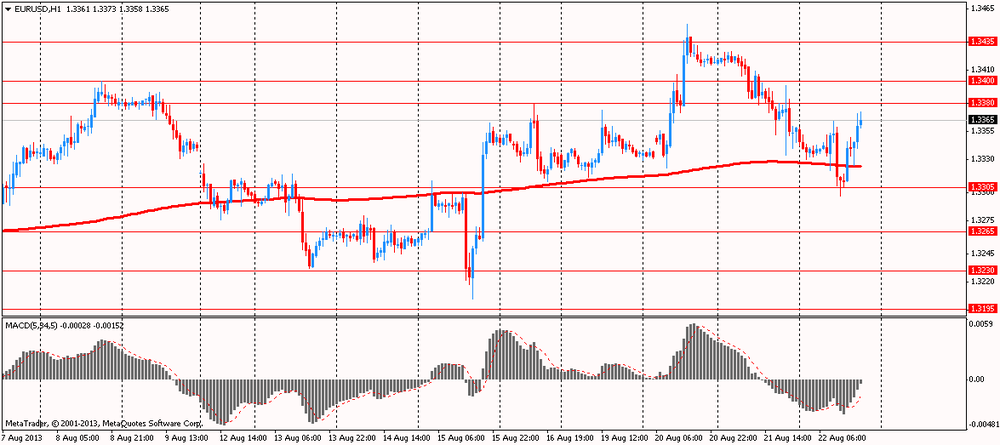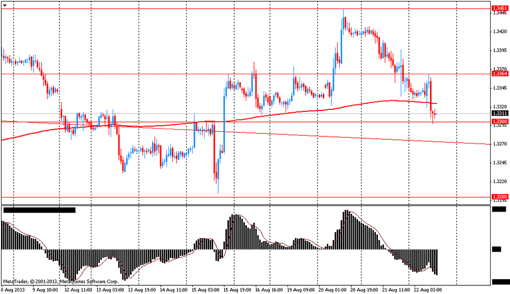 Дополнительное давление на американскую валюту оказала вчерашняя публикация протоколов последнего заседания ФРС. Политики «открыто поддерживают» мнение председателя Бена Бернанке о том, что снижение покупок облигаций может начаться позже в этом году, если экономика продолжит улучшаться. Некоторые члены заявили, что сокращение объемов может потребоваться в ближайшее время. Напомним, что 65% экономистов, считают, что в сентябре Федеральный комитет по открытым рынкам, вероятно, сократит ежемесячные покупки облигаций, которые составляют $85 млрд. Первый шаг Комитета по открытым рынкам, вероятно, будет небольшим, сокращение объемов покупок составит 10 млрд. долларов до 75 млрд. долларов, согласно средней оценке, полученной из опроса 48 экономистов в период с 9 по 13 августа.