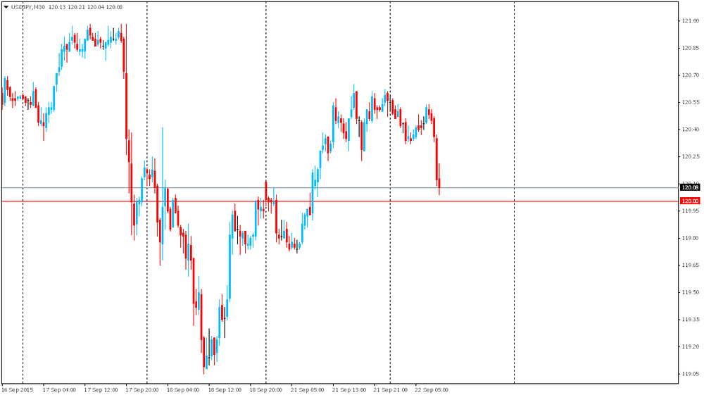 Пара USD/JPY снижается вслед за фондовыми площадками Европы на фоне роста спроса на валюту-убежище. На текущий момент пара приближается к уровню Y120.00, обновив сессионный минимум и ускорившись после прорыва часовой MA 200. Ближайшая поддержка находится на уровне Y120, далее Y119.71 (минимум 21 сентября).