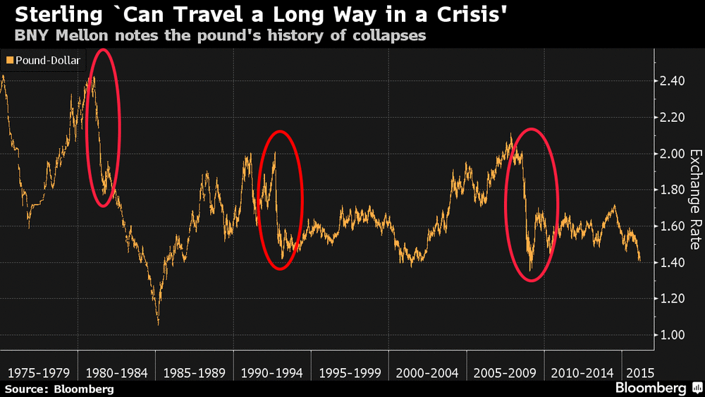 "Фунт может пройти долгий путь падения в условиях кризиса. Валюта потеряла по меньшей мере 25 процентов по отношению к доллару в течение шести месяцев во время обвалов в 1981, 1992 и 2008 годах. Кроме того, фунт записал потери около 15 процентов в течение шести других шестимесячных периодов с 1975 года. В то время как потери еще не достигли тех уровней, валюта упала на 1,8 процента в понедельник (максимальные темпы с 2010 года) после того, как мэр Лондона Борис Джонсон сказал, что он поддерживают выход Великобритании из состава Европейского Союза. За последние шесть месяцев фунт подешевел более чем на 10 процентов", - заявил эксперт Bank of New York Mellon Corp. Саймон Деррик.