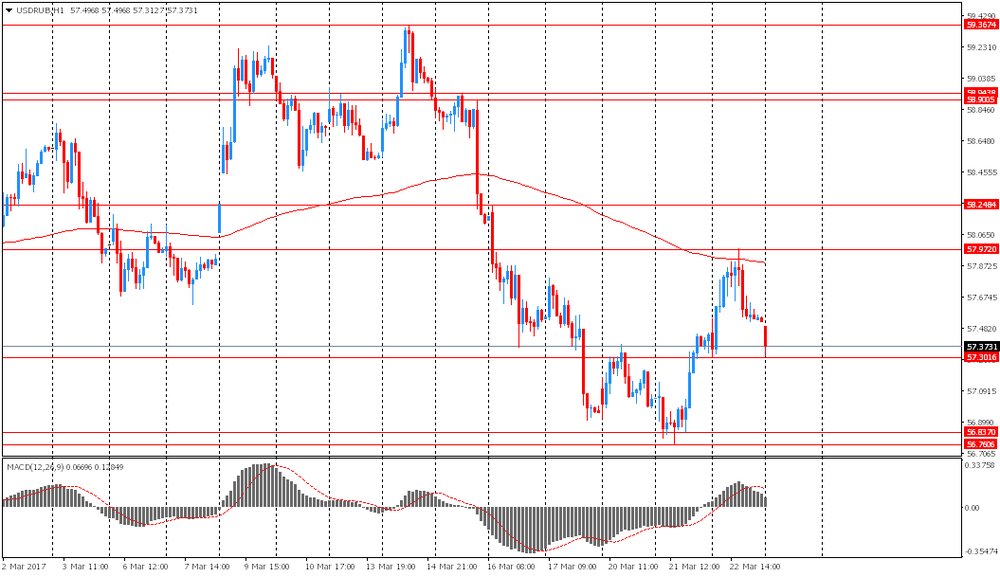 На открытие торгов пара USD/RUB упала на 20 копеек к отметке ₽57.30. В целом USD/RUB находится в нисходящем канале, поэтому лучше присматриваться к продажам пары на коррекциях. Поддержку этому сценарию оказывает также общее снижение доллара против большинства основных валют. Ближайшим сопротивлением по паре выступает вчерашний максимум 17 марта - ₽57.95 (MA 200 H1).