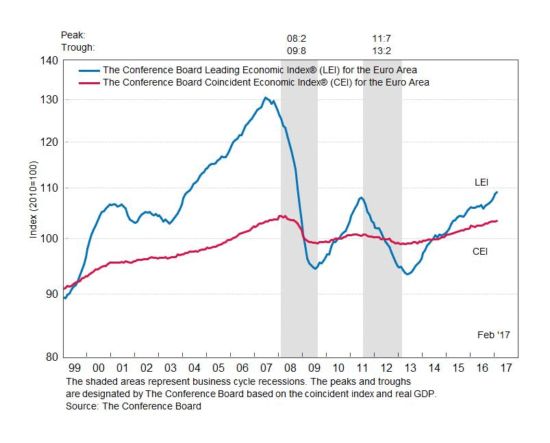 Результаты исследований, опубликованные Conference Board, показали: по итогам февраля ведущий экономический индекс (LEI) для еврозоны увеличился на 0,5 процента, до 109,2 пункта (2010=100). Такое изменение последовало за ростом на 0,6 процента в январе и повышением на 0,7 процента в декабре. В течение шести месяцев (с августа 2016 года по февраль 2017 года) показатель прибавил 2,6 процента по сравнению с увеличением на 2,7 процента за предыдущий 6-месячный период (с июля 2016 года по январь 2017 года).