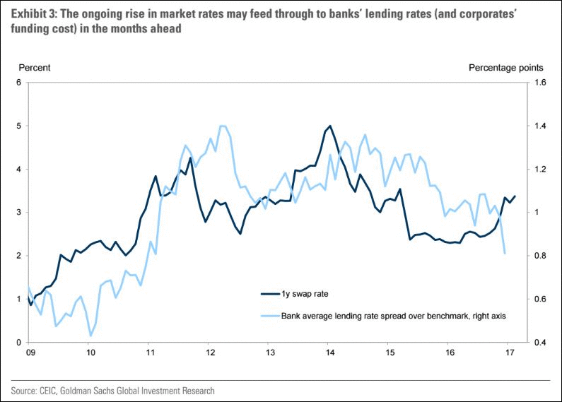Аналитики Goldman Sachs пишут, что одна из наиболее широко используемых ставок межбанковского заимствования в Китае выросла до самого высокого уровня с конца 2014 года в начале неделю, разжигая опасения по поводу того, что надвигается болезненный кредитный кризис. Итак, 7-дневная ставка РЕПО выросла до 5,5% во вторник с 3,85% в понедельник, прежде чем опустилась до 5% в среду. Причиной этому являются шаги Центробанка в направлении ужесточения денежно-кредитных условий.