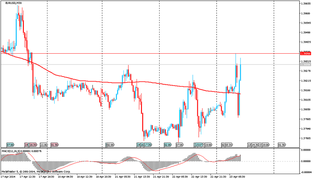 Стоит отметить, что правительство Франции прогнозирует дефицит бюджета в размере 3,8% от ВВП в 2014 году и 3% в 2015 году. Ранее прогнозировался дефицит бюджета Франции в размере 3,6% от ВВП в 2014 году и 2,8% в 2015 году.