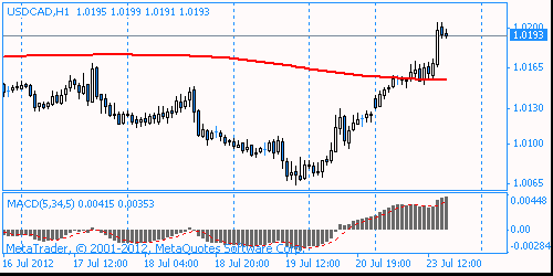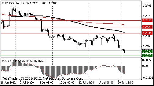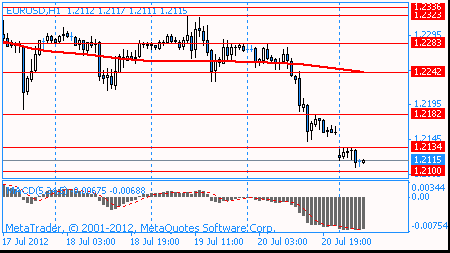 Поддержку курсу евро в понедельник оказала статистика из еврозоны по профициту внешнеторгового баланса, который вырос в мае до 6,9 миллиарда евро с пересмотренного показателя апреля в 3,7 миллиарда евро. Аналитики полагали, что профицит в мае составит четыре миллиарда евро. Евро достиг шестинедельного минимума против иены после того, как уровень инфляции в еврозоне в прошлом месяце достиг самого низкого значения с февраля 2011 года. Доллар упал против иены и стер прибыли по отношению к евро после того, как розничные продажи в США неожиданно упали, усилив предположения, что ФРС будет предпринимать дальнейшие шаги по укреплению экономики. Объем розничных продаж в США в июне 2012 года снизился на 0,5% по сравнению с маем и составил в денежном выражении 401,5 миллиарда долларов. Аналитики при этом ожидали роста продаж на 0,2%. Уменьшение продаж происходит в стране третий месяц подряд. Во вторник основные валютные пары проявили высокую волатильность на фоне выступления председателя ФРС Бена Бернанке в Конгрессе. Доллар вырос в начале выступления, так как первая реакция участников рынка была негативной, поскольку каких-либо конкретных сигналов относительно новых мер стимулирования американской экономики озвучено не было. Однако позже слова Бернанке о том, что понижательные риски усилились, были восприняты как один из таких сигналов. Бернанке снова повторил, что “федрезерв готов принять меры в случае необходимости”, и что “восстановление рынка труда проходит крайне медленно”. Давление на евро также оказали слабые данные по Индексу настроений в деловой среде от института ZEW, который упал до -19,6 в июле с -16,9 в июне. В среду в течение американской сессии доллар ослабил свои позиции против высокодоходных валют на фоне второй части выступления председателя ФРС Бена Бернанке в Конгрессе. Текст выступления Бернанке повторил речь, произнесенную им накануне. Хотя Бернанке подчеркнул готовность ЦБ к действиям, он воздержался от предоставления каких-либо деталей и не сообщил, будет ли это количественное смягчение и когда именно такие меры могут быть приняты. Ранее евро снизился после того, как канцлер Германии Ангела Меркель заявила, что «европейский проект» находится под угрозой, и если политики будут больше работать, подогревая интерес к решению долгового кризиса в регионе, он останется невыполнимым. Евро в четверг упал по отношению к доллару после того, как министр финансов Германии Вольфганг Шойбле заявил, что власти Испании должны взять на себя гарантии по финансированию фонда спасения, усилив опасения по поводу усиления суверенного долгового кризиса. Евро упал против иены, что было вызвано увеличением доходности облигаций Испании. Испания в четверг продала гособлигации со сроками обращения 2, 5 и 7 лет на общую сумму 2,98 млрд евро, что чуть ниже верхней границы целевого диапазона, находившейся на уровне 3 млрд евро.Спрос на бумаги снизился, что привело к резкому повышению стоимости заимствования для Мадрида. Между тем Франция 19 июля успешно разместила три транша векселей на 8,96 млрд евро. Средневзвешенная доходность при размещении 5-летних бумаг упала до рекордного минимума в 0,86% годовых против 1,43% в июне. Доходность 4-летних векселей снизилась с 1,05% до 0,53%. Поддержку единой валюте оказала новость о том, что агентство Fitch подтвердило рейти