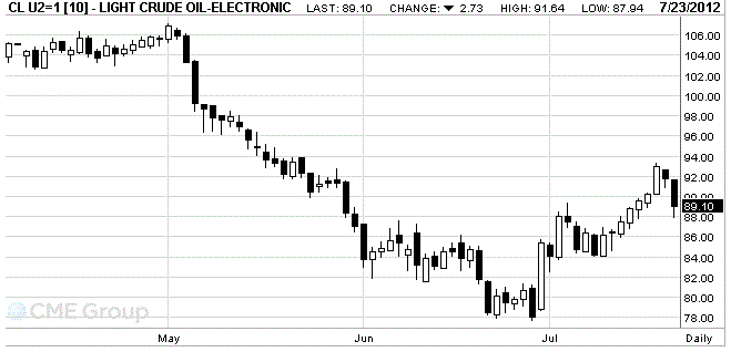 Стоимость фьючерсов с поставкой в сентябре на американскую легкую нефть марки WTI (Light Sweet Crude Oil) на NYMEX снизилась и сейчас составляет $89,05 за баррель.