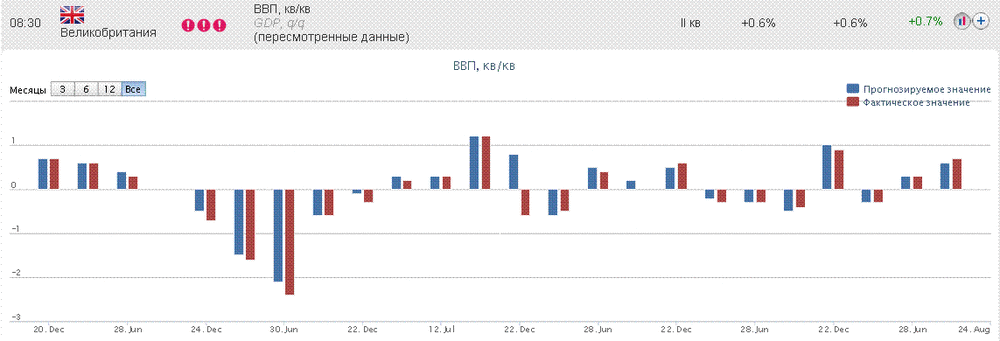 Согласно уточненным данным Управления национальной статистики Великобритании, темпы роста ВВП Великобритании во 2-м квартале была на уровне +0,7% кв/кв и +1,5% г/г, что оказалось выше предварительной оценки на уровне +0,6% кв/кв и +1,4% г/г. Сегодняшние данные указывают на то, что экономика Британии растет более быстрыми темпами, чем ожидают большинство экономистов и аналитиков.