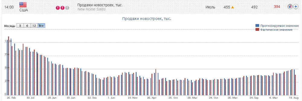 Как показали данные Бюро переписи населения США, по итогам июля продажи жилья на первичном рынке США были на уровне 394 тыс единиц в годовом исчислении с учетом сезонных поправок. Показатель оказался значительно ниже среднего прогноза аналитиков, который был на уровне 492 тыс. Значение за июнь было пересмотрено до 455 тыс с 497 тыс.