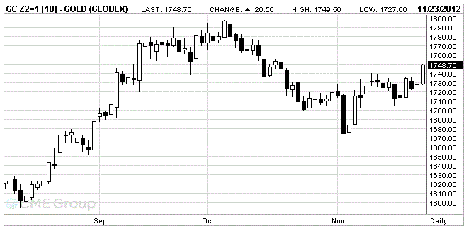 В течении большей части торговой сессии цены на золото демонстрировали небольшое повышение, что было вызвано представленными положительными данными по Германии, а также надеждами на, что кредиторы Греции приближаются к достижению соглашению относительно уровня долга. Но за последние пару часов ситуация резко изменилась, и стоимость золота резко возросла, преодолев при этом отметку в $1,745 за унцию и установив новый месячный максимум. Такая динамика была вызвана тем, что согласно информации, Саммит ЕС, посвященный бюджету, завершился без достижения соглашения, и как ожидается продолжиться в с январе следующего года. Отметим, что против проголосовали 26, а за только 1 представитель. Как стало известно, ключевыми вопросами, по которым возникли разногласия, был размер бюджета. Но несмотря на это достижение соглашения в отношении бюджета ЕС все еще возможно, но необходимы дополнительные сокращения расходов