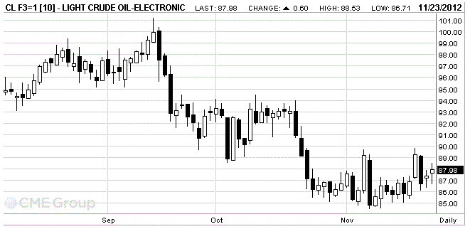 Стоимость декабрьских фьючерсов на американскую легкую нефть марки WTI (Light Sweet Crude Oil) вырсола до 87,98 доллара за баррель на Нью-Йоркской товарной бирже.