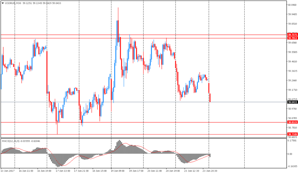 Давление на американскую валюту продолжает оказывать инаугурационная речь президента США Дональда Трампа, в которой отсутствовали четкие комментарии по поводу налогов и инвестиций, но прослеживалась агрессивная протекционистская риторика. В пятницу Трамп заявил, что его администрация будет следовать двум простым правилам: покупать американское и нанимать американцев. В целом, речь Трампа ослабила оптимизм инвесторов, ожидавших сокращения налогов и других мер по стимулированию. Между тем, сразу после инаугурации Трампа Белый дом опубликовал программу новой администрации, из которой следует, что президент намерен добиться энергетической независимости США от ОПЕК и "стран, враждебных интересам США". Кроме того, Белый дом сообщил, что США выйдут из Транстихоокеанского партнерства и пересмотрят соглашение о Североамериканской зоне свободной торговли, а также будут использовать все инструменты против стран, нарушающих торговые соглашения.