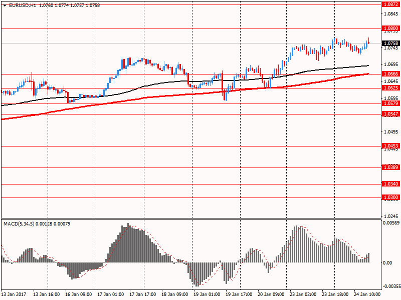 После выхода данных пара EUR/USD продолжила рост, и достигла максимума сессии. Сейчас пара торгуется на уровне $1.0758. Ближайшее сопротивление расположено на $1.0800 (психологический уровень). Сильная поддержка находится на уровне $1.0666 (МА(200) для Н1).