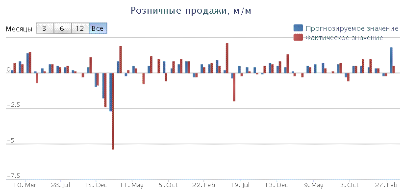 12:30 Канада Розничные продажи за исключением авто Февраль -0.5% +0.8%