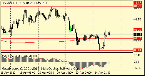 USD/JPY: пара отступила от сессионного минимума в области Y80,80 и сумела укрепится до Y81,27. Позже курс незначительно снизился.