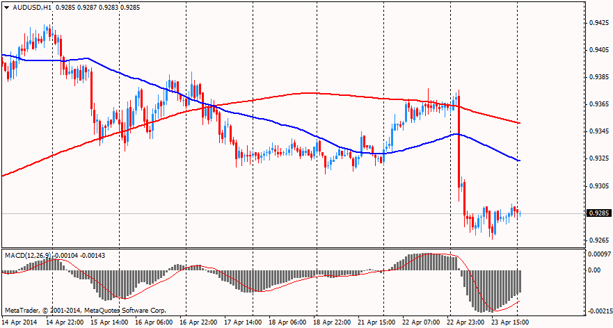 Чальз Сент-Арно и Мартин Велтон, экономисты из Nomura, ожидают, что начало цикла повышения процентной ставки Резервного банка Австралии будет в 2015 г., несмотря на недостаточную инфляцию в первом квартале, по вчерашним данным: «Что касается рынка, австралийский доллар отреагировал на более низкие, чем ожидалось, цифры по инфляции, снижением 3/4 цента с 0,9375 до 0,9300.