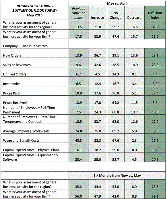 Фирмы, участвующие в обследовании, продолжали сообщать об умеренном росте текущей активности. 21 процент фирм заявили об увеличении региональной деятельности в этом месяце, в то время как 59 процентов сообщили об отсутствии изменений. Тем временем, 37 процентов фирм сообщили об увеличении новых заказов, по сравнению с 14 процентами фирм, которые сообщили об уменьшении. Большее число фирм сообщили о росте цен на сырье в этом месяце (28 процентов) по сравнению с прошлым месяцем (20 процентов). 25 процентов респондентов заявили об увеличении расходов на оборудование и программное, но гораздо большая доля, 59 процентов, сообщили об отсутствии изменений.