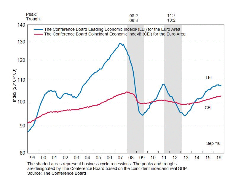 Итоги исследований, опубликованные Conference Board, показали: по итогам сентября ведущий экономический индекс (LEI) для еврозоны увеличился на 0,1 процента, до уровня 107,5 пункта (2010=100). Напомним, данный показатель вырос на 0,2 процента в августе и сократился на 0,6 процента в июле. В течение шести месяцев (с марта по сентябрь 2016 года) индекс вырос на 0,3 процента по сравнению с повышением на 0,5 процента за предыдущий шестимесячный период (с февраля по август 2016 года).