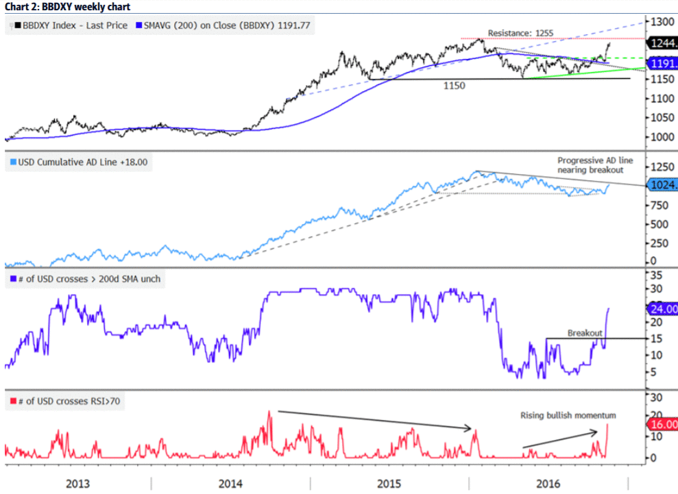 "Индекс доллара США приближается к своим историческим максимумам. Количество кросс-пар с USD, которые пересекли свои 200-дневную скользящую среднюю, становится больше. Тем временем, число долларовых кроссов, которые достигли области перекупленности по индикатору RSI (бычий импульс), также продолжает расти. Кумулятивная линия роста-падения доллара США недавно просигнализировала о тактическом укреплении доллара. При условии что она преодолеет линию тренда, ситуация может стать полностью бычьей (для этого нужно закрыться выше 1255).