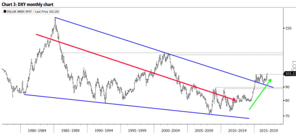 Если смотреть на месячный график, индекс DXY продолжает прорыв фигуры "клин". Вместе с тем, долгосрочный график индекса DXY предполагает значительный потенциал роста для доллара. На этой неделе индекс поднялся выше уровня 100, вырвавшись из своего двухлетнего диапазона. Учитывая сложившуюся ситуацию, мы полагаем, что долгосрочным целевым уровнем для индекса DXY является отметка 120", - заявили эксперты.
