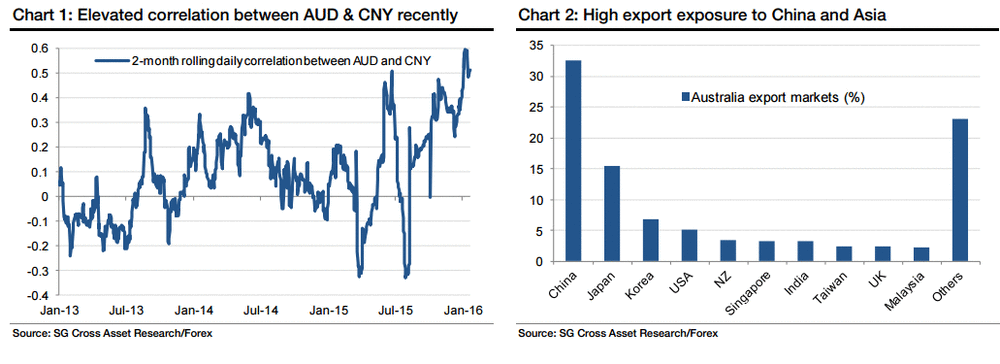 "Дальнейшая эскалация обеспокоенности касательно темпов экономического роста Китая будет очень разрушительной для австралийского доллара, особенно если юань значительно обесценится в течение ближайших нескольких месяцев. Ежедневная корреляция между юаней и австралийским долларом было довольно высокой с середины 2015 года, когда китайский фондовый рынок попал под массивные распродажи (Диаграмма 1). Тогда курс австралийского доллара снизился до новых циклических минимумов, так как пара USD/CNY повысилась. На сегодняшний день среди валют G10 австралийский доллар является одним из наиболее чувствительных к макро рискам Китая", - заявили в Societe Generale.