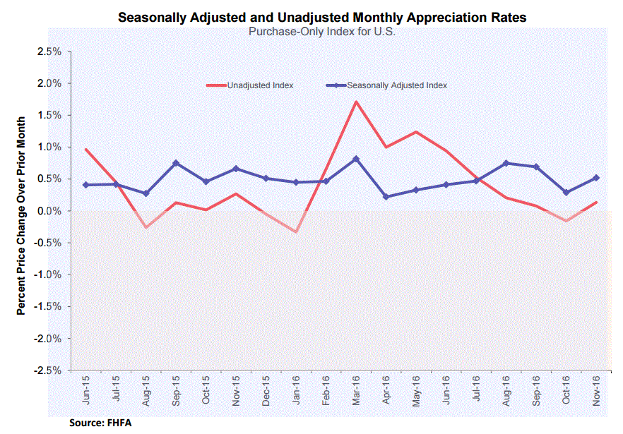 Как показали данные, опубликованные Федеральным агентством по финансированию жилищного строительства, с учетом сезонных колебаний индекс цен на жилье в США вырос на 0,5% в ноябре, что оказалось быстрее, чем повышение на 0,3% в предыдущем месяце (пересмотрено с +0,4%). Кроме того, последний темп роста превысил прогнозы (+0,4%). По сравнению с ноябрем 2015 года, жилье подорожало на 6,1%. По итогам октября цены на жилье выросли на 6,2% в годовом выражении. Напомним, индекс цен на жилье является широким индикатором движения цен на жилье для одной семьи, с ипотечными кредитами Fannie Mae и Freddie Mac.