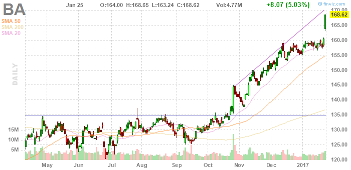 На текущий момент акции Boeing (BA) котируются по $168,62 (+5,03%)