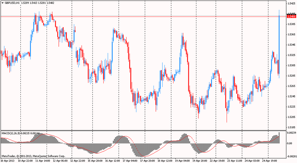 Курс британского фунта существенно вырос, чему способствовала публикация британских данных. Заметим, что сегодняшний отчет по ВВП Великобритании за 1 квартал показал, что экономике Великобритании удалось избежать страшной "тройной" рецессии, показав при этом рост на уровне 0,3%, что было больше среднего прогноза аналитиков на уровне 0,1%. Причиной неожиданного роста экономики стал сектор услуг, который расширился на с 0,6%, а наиболее сильными отраслями оказались транспорт и связь (+1,4%), что полностью расходится с сообщениями о том, что плохая погода нарушила каналы распределения продукции. Добавим, что Банк Англии в настоящее время находится в более удобной ситуации по поводу сохранения текущей кредитно-денежной политики на своем следующем заседании через две недели, но рынки уже получали намек, что это может произойти, после того как вчерашнее объявление о росте программы по финансированию банковского сектора указало на то, что Банк Англии будет откладывать расширение количественного смягчения и направит свои ресурсы на целевую политику, направленную на расширение кредитных каналов.