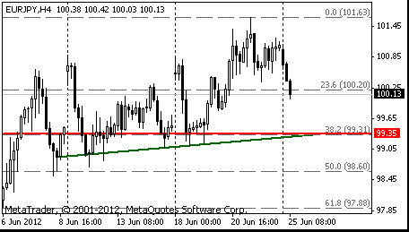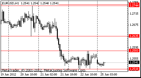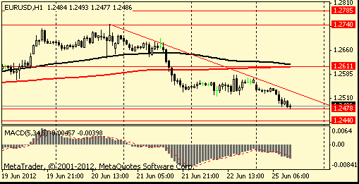 Также негативное влияние на курс евро оказало предупреждение инвестора-миллиардера Джорджа Сороса о крахе евро, в случае, если лидеры ЕС не сумеют принять нужных решений, что бы обуздать долговой кризис в евро регионе на двухдневном саммите. Таким образом, в центре внимания будет находиться саммит ЕС, намеченный на 28-29 июня, где будут обсуждаться различные вопросы - от введения единых долговых обязательств до налогово-бюджетного и финансового союза, а также возможного пересмотра условий предоставления помощи для Греции. Напомним, что саммит является первой встречей европейских лидеров с новым греческим правительством. Новое коалиционное правительство Греции будет стремиться продлить "как минимум на два года", до 2016 года, срок достижения целевых уровней бюджетного дефицита. Афины также предлагают ряд снижении налогов и другие меры на следующие четыре года, чтобы поддержать социальные группы с низкими доходами. Об этом свидетельствует документ, опубликованный в субботу греческим правительством. Все это может привести к конфликту Греции с международными кредиторами. Хочется отметить, что сам премьер-министр Греции Антонис Самарас не примет участие в саммите по рекомендации своего лечащего врача, после проведения операции на сетчатке глаза.
