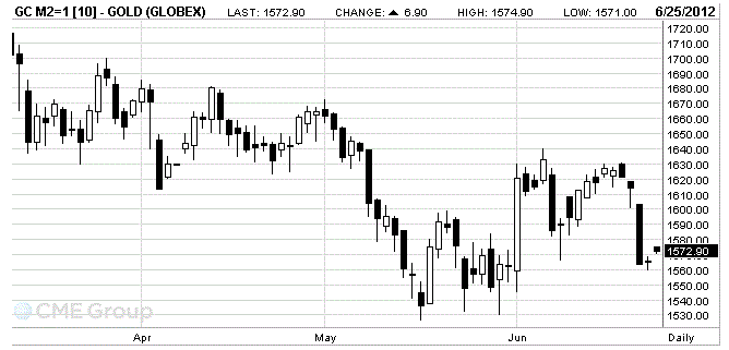 Июньский фьючерс на золото на COMEX сейчас стоит 1572,90 доллара за унцию.