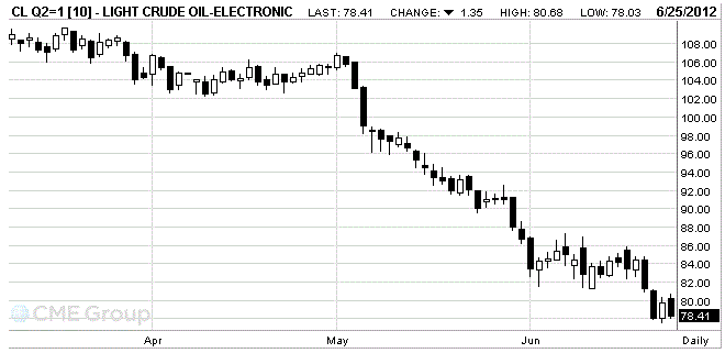 Стоимость августовских фьючерсов на американскую легкую нефть марки WTI (Light Sweet Crude Oil) на NYMEX сегодня снизилась до $78,33 за баррель. Цена августовских фьючерсов на североморскую нефтяную смесь марки Brent упала на $1,49 до $90,06 за баррель на ICE Futures Europe Exchange.