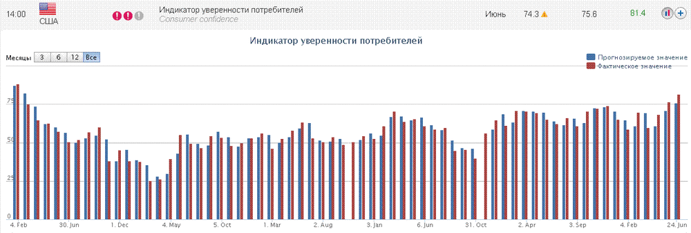 Индекс доверия потребителей от Conference Board в июне вырос до пятилетнего максимума: 81,4 против 74,3 в мае. Это максимальное значение с января 2008 г.