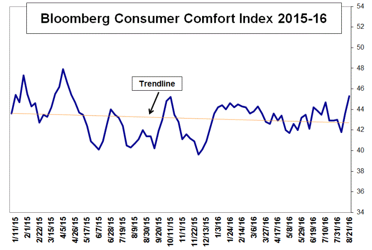 Согласно данным, за неделю, завершившуюся 21 августа, индекс потребительского комфорта поднялся до 45,3 пункта с 43,6 пункта неделей ранее (по 14 августа). Сейчас значение индекса точно соответствует его докризисному среднему показателю. За последние две недели индекс вырос на 3,5 процента, записав максимальное двухнедельное повышением за более чем семь лет.