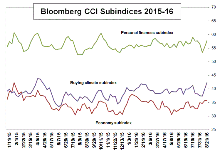 Что касается компонентов индекса, рост зафиксировали три из трех показателей. Датчик личных финансов увеличился на 2,5 пункта, до 57,8 пункта, продемонстрировав наибольший прирост с января 2015 года. В настоящее время индекс находится выше своего среднего значения текущего года и долгосрочного среднего показателя. Что касается датчика покупательского климата, который показывает, хорошее ли сейчас время, чтобы приобретать товары и услуги, он вырос с 39,8 пункта до 42,4 пункта, достигнув максимума с апреля 2015 года. Среднее значение с начала 2016 года составило 39,6 пункта. Тем временем, индекс, оценивающий мнение в отношении экономики в целом, поднялся до 5,5-месячного максимума, и составил 35,8 пункта против 35,7 неделей ранее. Среднее значение данного показателя с начала года составило 34,1 пункта
