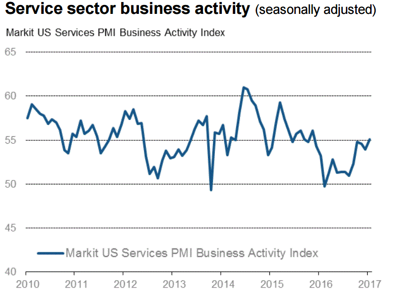 Как показали предварительные данные, представленные Markit Economics, активность в сфере услуг США заметно выросла в январе, превысив прогнозы, и достигнув максимума с ноября 2015 года. Индекс менеджеров по снабжению (PMI) для сферы услуг в январе увеличился до 55,1 пункта по сравнению с 53,9 пункта в предыдущем месяце. Экономисты ожидали, что показатель составит 54,4 пункта. Стоит подчеркнуть, индекс остается выше 50 пунктов, что указывает на расширение активности в секторе, уже 11-й месяц подряд.
