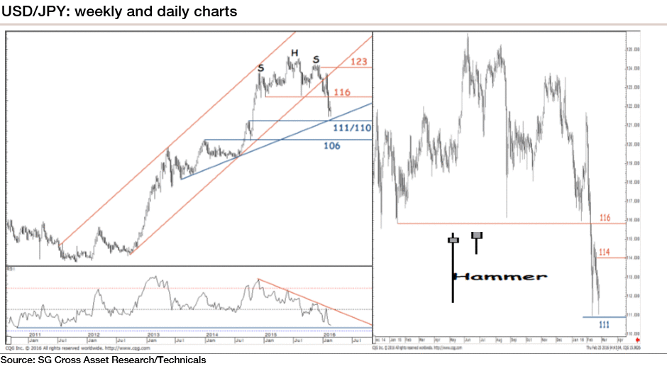 «Пара USD/JPY нарушила многолетний восходящий канал, а затем подтвердила широкий патерн «голова и плечи». Она достигла последних максимумов сентября на уровне Y111/Y110. Прогнозируемой целью является отметке Y106. Тем не менее, еженедельный индикатор в настоящее время достиг многолетнего графического минимума, что предполагает возможность кратковременной паузы. Формирование на дневном графике модели «молот» на Y111/Y110 указывает на то, что прорыв ниже будет необходимо, чтобы сигнализировать о дальнейшем ускорении движения вниз. Корректирующий отскок не может быть исключен в направлении Y114, до 76,4% отката от недавних максимумов. Отметка Y116 остается ключевым сопротивлением», - заявили в SocGen.