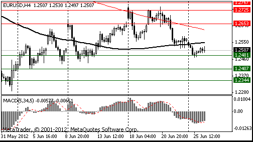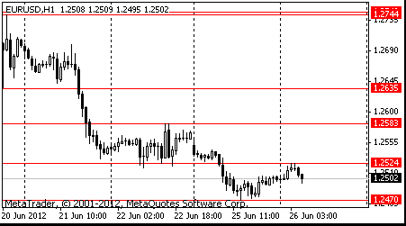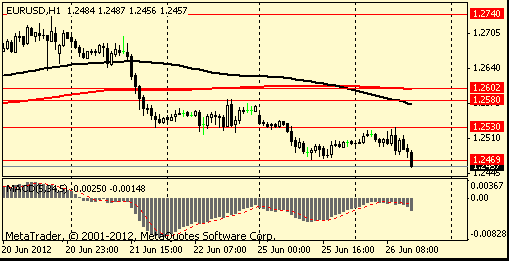 Евро упал против основных валют на фоне неутешительных аукционов по гособлигациям Испании и Италии, а также в связи с отсутствием в участников рынка уверенности в том, что по итогам грядущего саммита ЕС, который намечен на 28-29 июня, будут приняты какие-либо важные меры, которые позволят справится с региону с долговым кризисом и замедлением экономического роста.