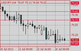 USD/JPY показал сегодня минимумы в районе Y77.85 прежде чем восстановиться до Y78.20. Однако удержаться на плаву курсу не удалось и доллар снова вернулся к фигуре.