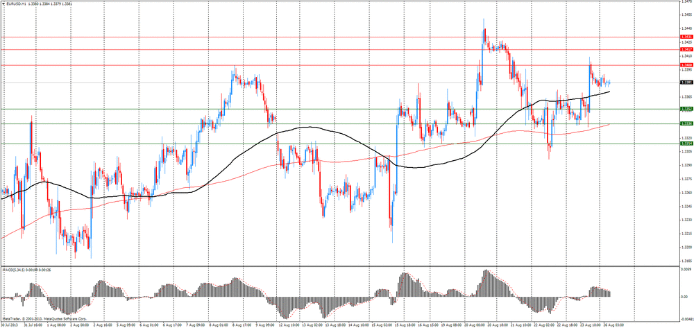 В пятницу слабые данные по продажам новостроек вызвали резкое снижение американской валюты. Как показали данные Бюро переписи населения США, по итогам июля продажи жилья на первичном рынке США были на уровне 394 тыс единиц в годовом исчислении с учетом сезонных поправок. Показатель оказался значительно ниже среднего прогноза аналитиков, который был на уровне 492 тыс. Значение за июнь было пересмотрено до 455 тыс с 497 тыс. С учетом пересмотренных данных, продажи жилья на первичном рынке США снижались в мае и июле и показали только небольшой прирост в апреле и июне. Несмотря на пересмотр в сторону понижения, продажи по-прежнему на 6,0% превышают аналогичный период прошлого года. Поддержку евро также оказали данные по потребительскому доверию в еврозоне. Индекс доверия потребителей в августе вырос до -15,6 с -17,4 — до максимального уровня с июля 2011 г., что превысило ожидания экономистов на уровне -16,5. Индекс продолжает устойчиво расти на протяжении девяти месяцев.