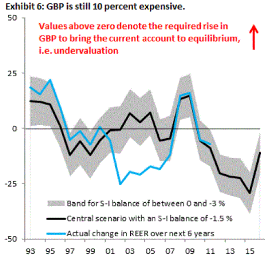 "Сигналы ряда моделей, что фунт стоит дешево, не учитывает то, как волнения из-за Брекзита могут отразится на экономике Великобритании и - потенциально - снизить справедливую стоимость валюты. В результате, мы используем другой подход, который вычисляет степень падения курса, необходимую для приведения текущего счета до нового равновесия после Брекзита", - добавили эксперты.