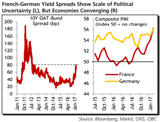 "В настоящее время курс евро находится под влиянием двух факторов: улучшением экономической траектории и усилением популярности популистских политических течений. В краткосрочной перспективе, последний фактор, как ожидается, победит, поскольку озабоченность по поводу роста популярности Марин Ле Пен ведет к расширению спрэдов доходности франко-германских облигаций и ослаблению евро. Однако, исходя из предположения, что она не победит на президентских выборах, которые состоятся 7 мая, вскоре рынки должны начать фокусироваться на лучшем экономическом климате. Напомним, недавно композитный индекс PMI еврозоны достиг своего самого высокого уровня с апреля 2011 года. Позитива также добавил тот факт, что рост активности отмечался на широкой основе, и Франция по показателям начала приближаться к лидеру блока, а именно Германии. Таким образом, после того, как в краткосрочной перспективе евро ослабнет, пара EUR/USD должна восстановиться к концу года. В целом, мы прогнозируем, что пара EUR/USD будет торговаться на $1,04, $1,07, $1,10, и $1,12 к концу 1-го, 2-го, 3-го, и 4-го кварталов соответственно", - заявили эксперты.