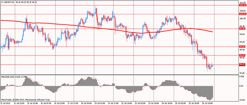 Доллар США в пятницу упал против большинства основных валют, несмотря на экономические данные США, которые превзошли ожидания. Индекс потребительского доверия США, достигший максимума за 6 лет, не смог поднять доллар. Согласно данным, в июле индекс потребительских настроений от Thomson-Reuters и Мичиганского института поднялся до уровня 85,1, по сравнению с окончательным чтением за июнь на уровне 84,1. Стоит отметить, что согласно средним оценкам экспертов, данный индекс должен был вырасти только до отметки 84,0 от 83,9 (предварительное чтение за июль). Падение доллара было вызвано обеспокоенностью инвесторов по поводу возможных изменений ФРС ключевых ставок для сокращения программы стимулирования. В четверг The Wall Street Journal написал, что на заседании по обсуждению дальнейшей политики 30-31 июля центральный банк сохранит программу покупки облигаций. Тем не менее, руководство, вероятно, будет обсуждать пересмотр своих ориентиров. Автор статьи сообщил, что центральный банк может понизить порог безработицы 6,5% или заявить, что краткосрочные процентные ставки не повысятся при снижении инфляции. Такие шаги будут указывать на то, что сворачивание программы покупки облигаций на 85 млдр долларов США в месяц может наступить не так скоро, как считали инвесторы.