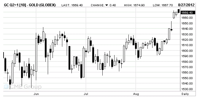 Стоимость августовского фьючерса на золото на COMEX сейчас составляет 1669.4 доллара за унцию.